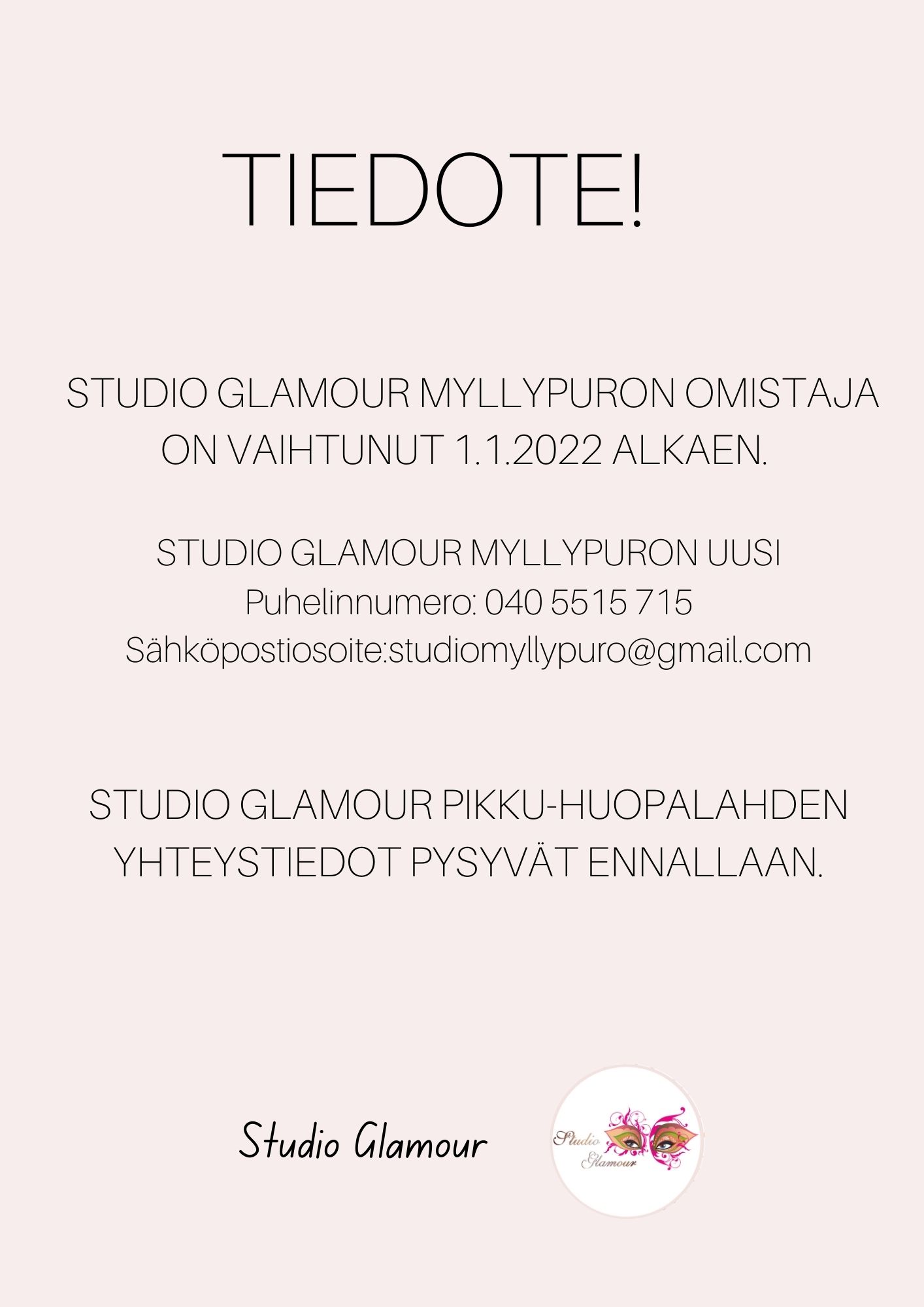 Haluamme lämpimästi toivottaa sinut tervetulleeksi Studio Glamouriin. Palvelemme teitä kauniissa ja tilavassa Pikku Huopalahden hoitolassamme sekä Myllypuron ostarin hoitolassamme.